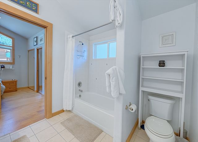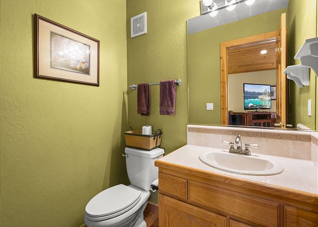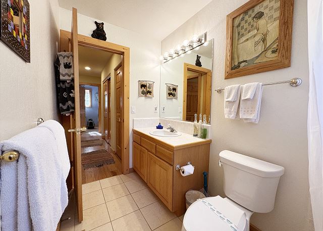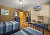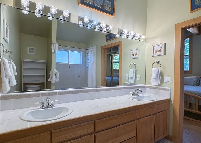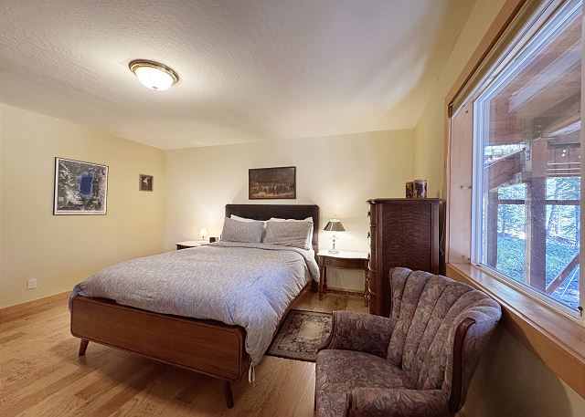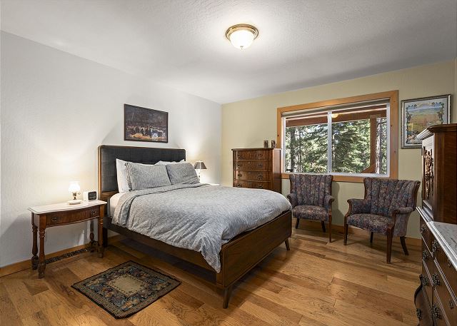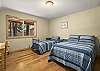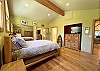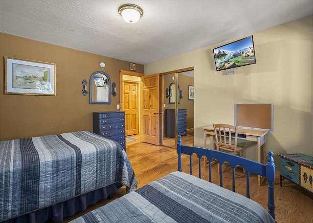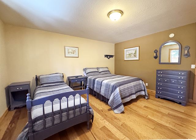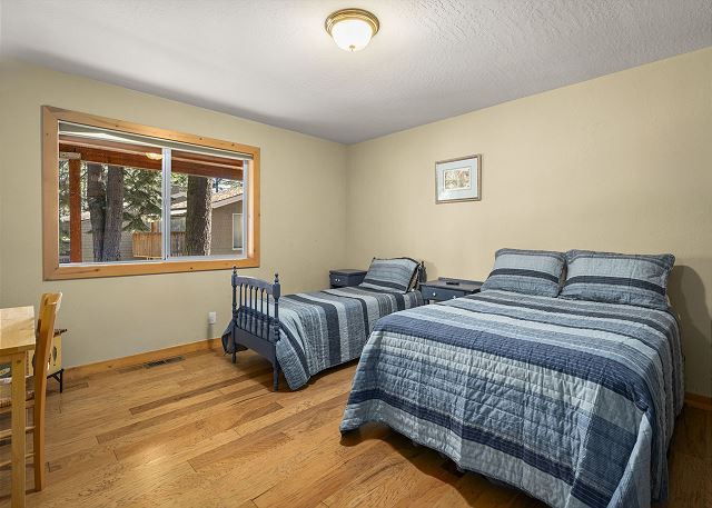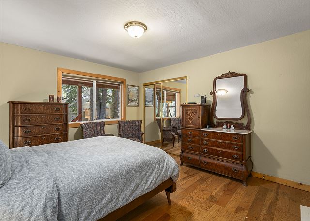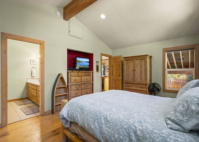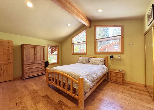 The upstairs primary bedroom has a TV, and boasts vaulted ceilings, large windows, two closets, and bathroom with two sinks. Downstairs you will find a cozy room with a double bed, and another room with two twin beds and a TV. This beautiful home has level access, and parking for up to 4 CARS (please park in designated area only) and is also equipped with a BBQ gas grill. Other amenities include washer/dryer, dishwasher, microwave, three televisions with satellite & wireless internet access.