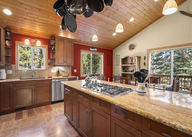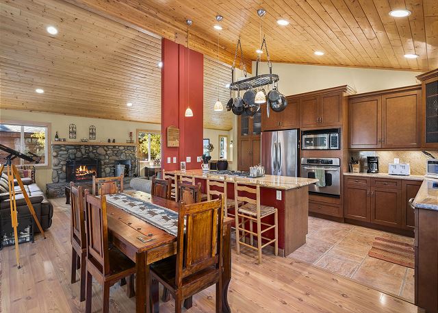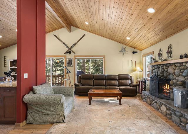 This tastefully furnished three bedroom, two and half bath home has all you’ll need to enjoy a perfect holiday. The vaulted, knotty pine ceilings and large river rock fireplace appoint the warm and spacious great room making it the perfect place to gather with friends and family. The open kitchen is fully equipped with stainless steel appliances, granite counter tops, bar seating, and an adjacent and comfortable dining area. Accommodating up to 6 people, it is a great space for family meals or that holiday feast!