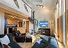 Chris’s Condo welcomes you into an open space zone of a beautifully updated and well-equipped kitchen and a living area with a high-ceiling and skylights, on demand electric fireplace and TV (wifi TV in main living area with soundbar; roku TV downstairs for streaming; and Amazon Firestick in the upstairs loft bedroom for streaming). The living area has a wrap-around sofa and big leather chair, great for relaxing at the end of your Tahoe day. There is a full kitchen and island with six stools in the center for dining and hanging out. The space is easy to enjoy with a balcony and lots of windows with views of trees. A beautiful spiral staircase takes you up to the loft bedroom with a roomy full bathroom, or downstairs to the private, full floor, spacious bedroom and bathroom with a stone walk-in shower. There is even a mini refrigerator for your midnight munchies!